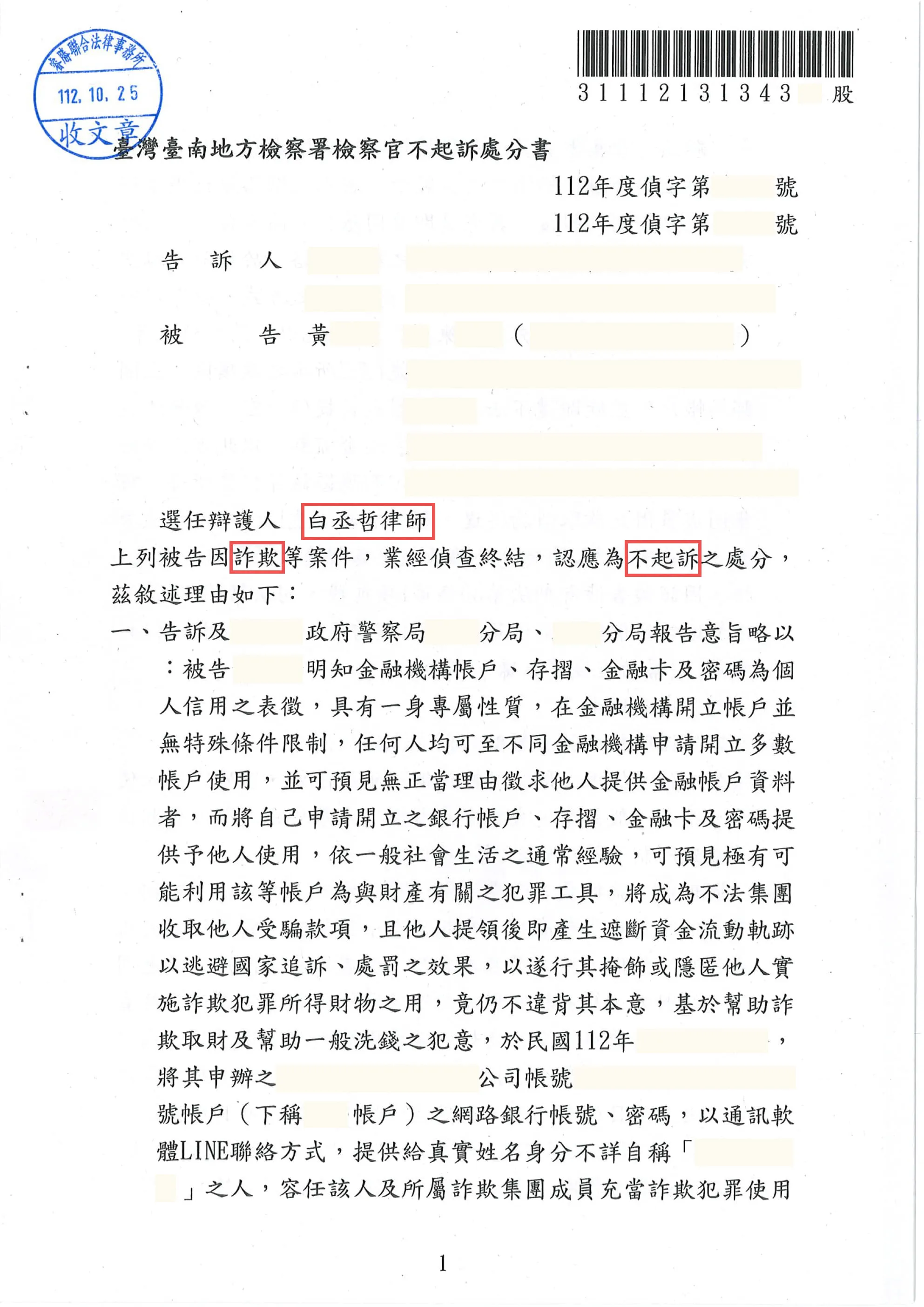 案經臺南地方檢察署採認律師上開主張,而為被告「不起訴」處分。聯繫本所