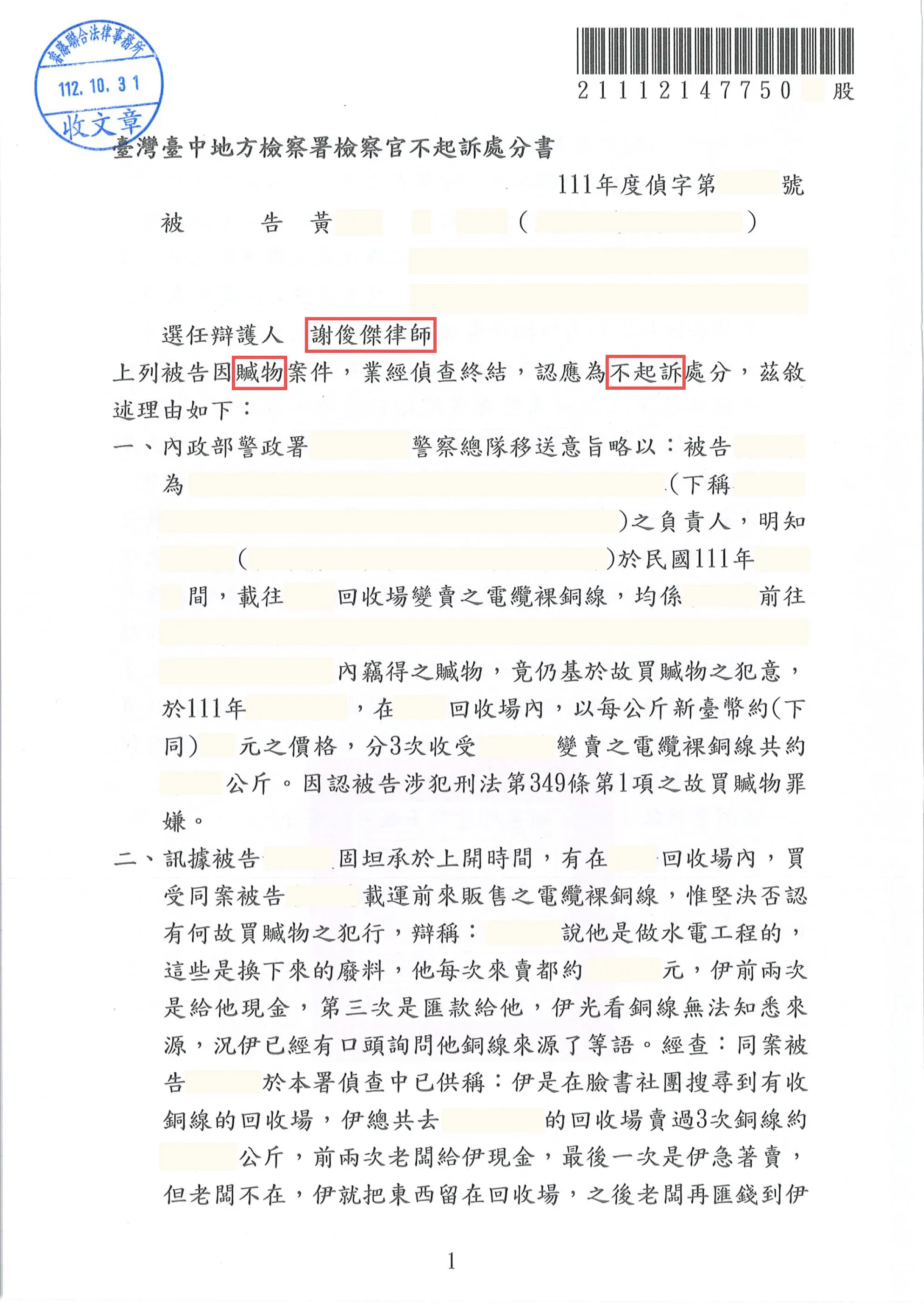 首頁 > 成功案例 > 刑事案件 > 回收變賣物品 竟涉犯贓物罪-不起訴