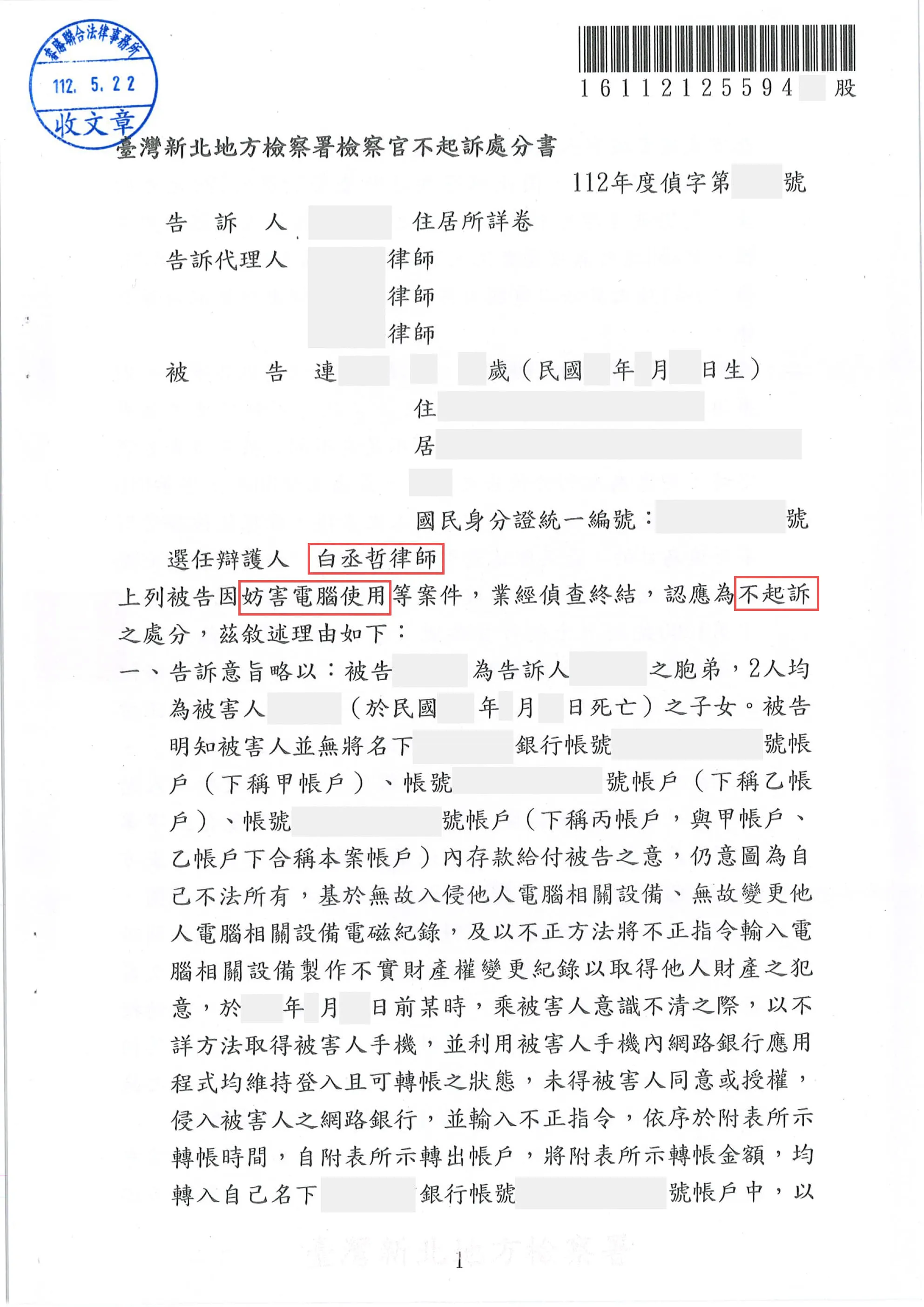 案經新北地方檢察署採認律師上開主張,而為被告「不起訴」處分。