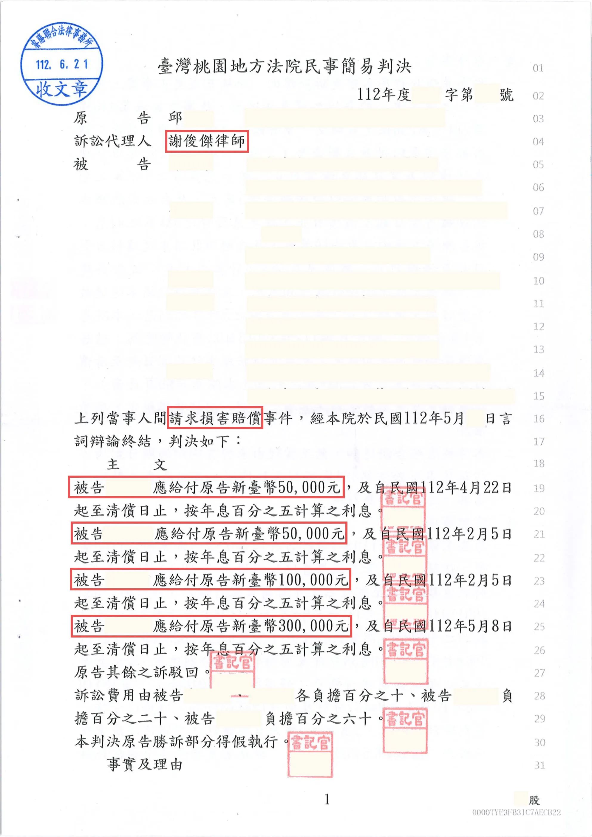 案經桃園地方法院採認律師上開主張,而為原告「勝訴」判決。
