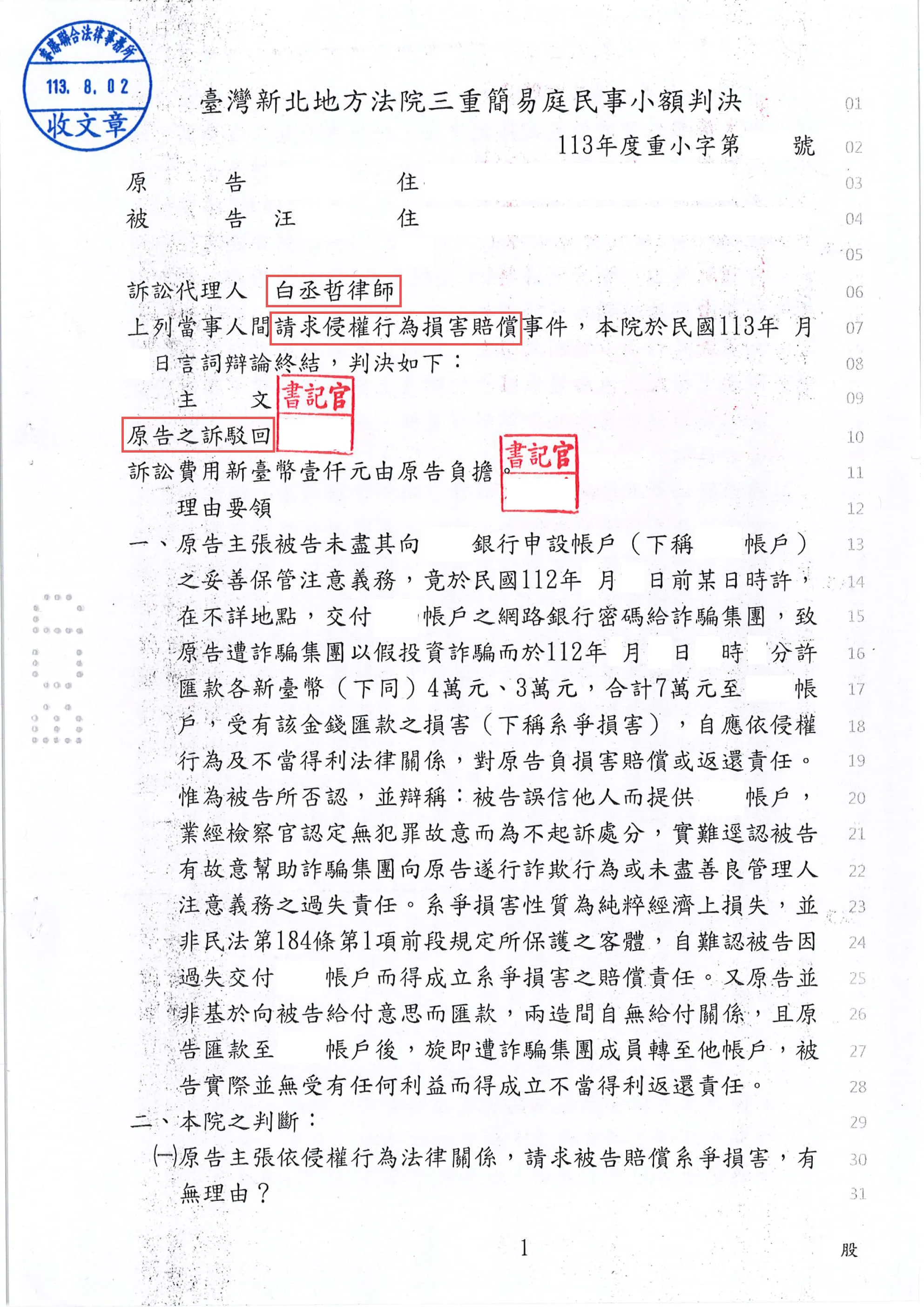 > 帳戶淪為詐團人頭帳戶 遭被害人請求損賠-勝訴