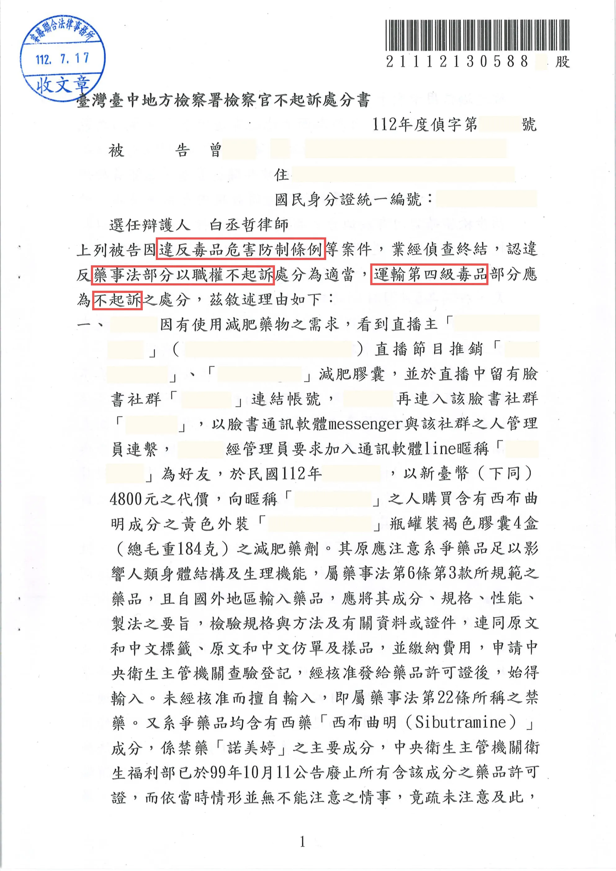 當事人因有購買減肥藥的需求,某日上網看到直播主介紹減肥藥,便和社群管理員聯絡購買減肥藥